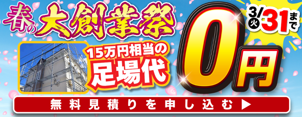 大創業祭のご成約特典として15万円相当の足場代が無料です!
