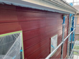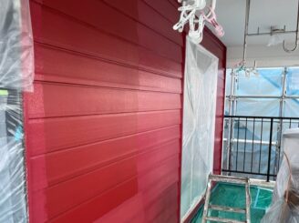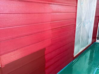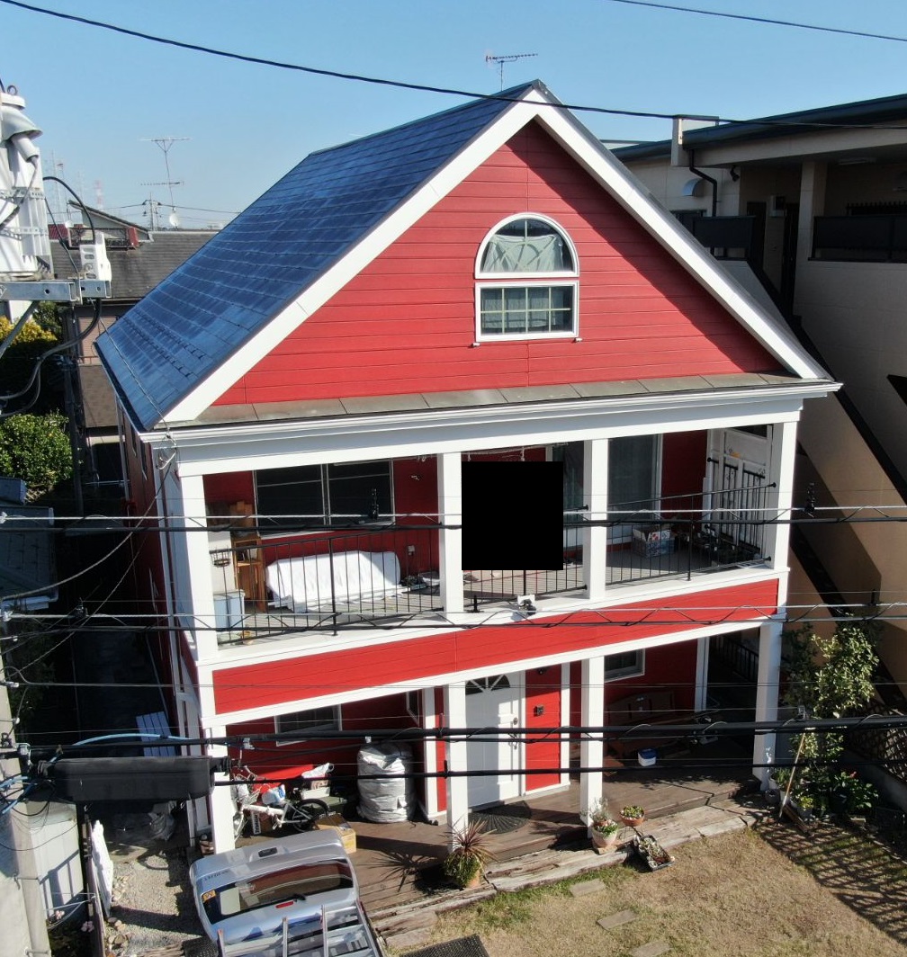 外壁は「05-30T(レッド系)調色」というお色、屋根は「カーボングレー」というお色で塗装しました。鮮やかなレッド系の外壁にホワイトのラインを組み合わせた、アメリカンテイストが映える配色です。赤の持つ華やかさと温かさを活かしつつ、白が外観全体を軽やかに引き締め、清潔感のある印象に仕上げています。さらに、屋根の落ち着いたダークカラーが全体のバランスを整え、メリハリのある美しい外観になりました。