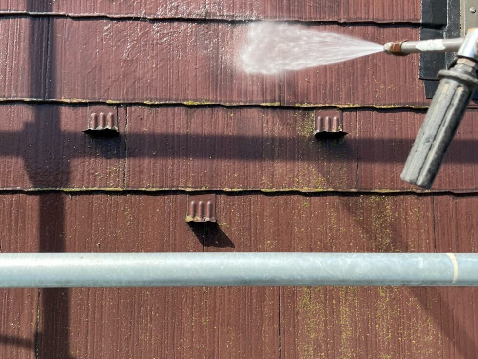 屋根の洗浄です。塗装前にしっかりと屋根の汚れを落とします。