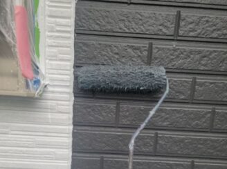 外壁のアクセント部分の中塗りになります。スレートグレーの3分艶で塗装します。乾燥時間を経て上塗りします。
