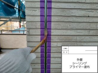 古いシーリングを撤去した後、接着性を高めるために「プライマー」を塗布します。 この工程を丁寧に行うことで、新しいシーリング材がしっかりと密着し、 剥がれ・割れ・隙間といった劣化を防ぐことができます。