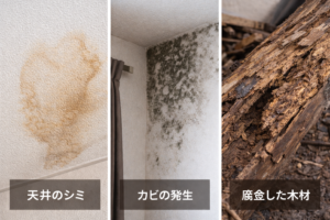 特に木造住宅の場合、内部の柱や梁が腐食すると大規模な修繕が必要になります。結果として、本来10万円〜30万円で済んだ修理が、100万円以上に膨らむケースも珍しくありません。