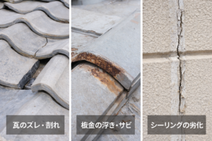 瓦屋根の場合、「瓦自体は丈夫」ですが、その下の防水シート(ルーフィング)が劣化すると雨水が侵入します。また、棟板金の釘浮きや外壁のひび割れも雨漏れの原因になります。